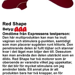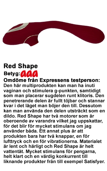 ”Den här multiprodukten kan man ha inuti vaginan och stimulera g-punkten, samtidigt som man placerar sugdelen runt klitoris. Den penetrerande delen är fullt töjbar och stannar kvar i det läget man böjer den till. Dessutom kan man använda den delen utsträckt som en dildo. Red Shape har två motorer som är oberoende av varandra vilket jag uppskattar, för det blir för mycket stimulans om jag använder båda. Ett annat plus är att produkten bara har två knappar, en för lufttryck och en för vibrationerna. Materialet är lent och härligt och Red Shape är helt vattentät. Mycket stimulans för pengarna, helt klart och en värdig konkurrent till liknande produkter från till exempel Satisfyer.”