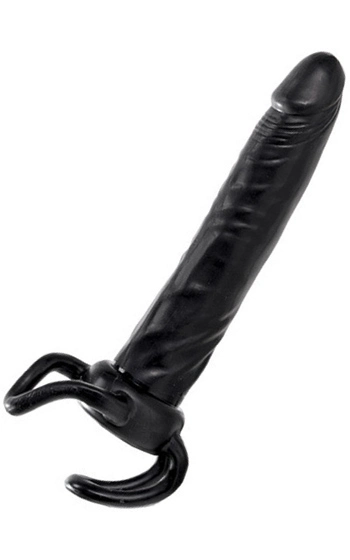 Beskrivning: Strap-On som bärs av honom, och ger dig en extra penis i en lite smalare storlek! För dig som vill erbjuda din partner en skön dubbelmacka utan att blanda in en tredje part. Dildon har en gummiring ovan och en under, för att monteras mellan din pung och penis. Används analt eller vaginalt beroende på din vilken sexställning ni kör, och vilket hål du själv penetrerar. Förutom att ge en stadig passform gör även ringarna att din egen penis blir något hårdare, samt fördröjer utlösningen en aning. Den mindre ringen är 3 cm i diameter, och den stora (för pungen) ca 4,5 cm.