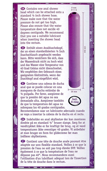 Beskrivning: Water Clean Strong är ett duschmunstycke för analen som med lätthet kan sättas på en standard duschslang. Duschmunstycket är designat för ett extra högt vattentrycket som sprutar rakt upp med tjock stråle. Se till att vatten-temperaturen ej överstiger 40 grader och att vattentrycket inte blir för högt. Vi rekommenderar att du använder ett
