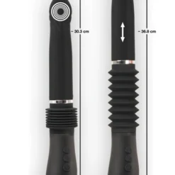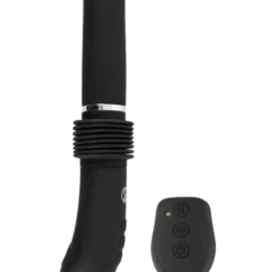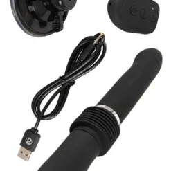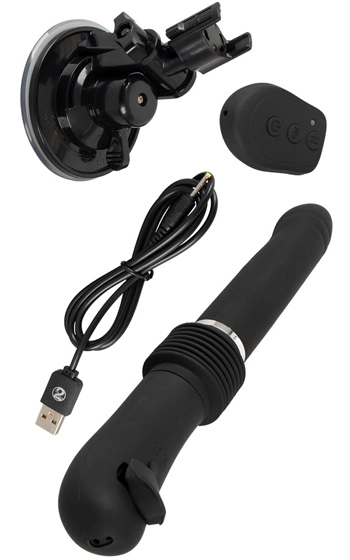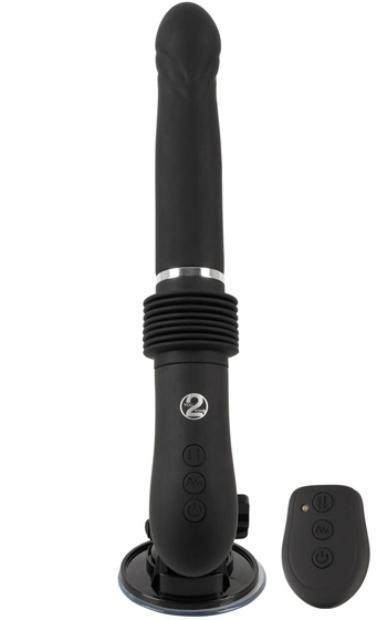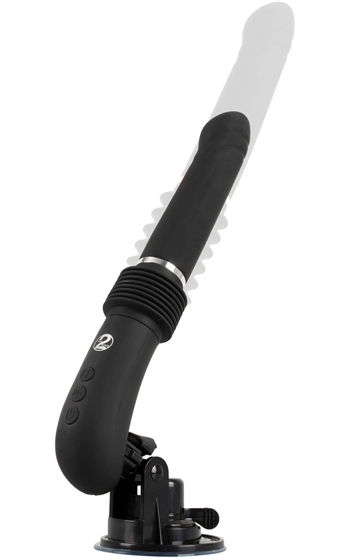 Den övre knappen aktiverar läget där den rör sig upp och ned, tryck på den igen för att justera hastigheten på rörelserna. Modellen har även rese-lås, som aktiveras genom att startknappen hålls intryckt i 2-3 sekunder. Fucking machine kan användas både via knapparna direkt på produkten, eller med den trådlösa fjärrkontrollen. 3 olika stöthastigheter samt 7 olika vibrationsprogram.