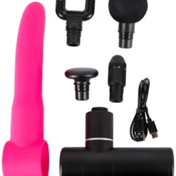 Beskrivning: Klassisk, kraftull och uppladdningsbar massagepistol som huvudsakligen är till för att massera ömmande muskler på kroppen. Det fiffiga med just denna produkt är att den även innehåller en dildo samt andra tillbehör som gör att du även kan njuta av den intimt.